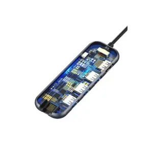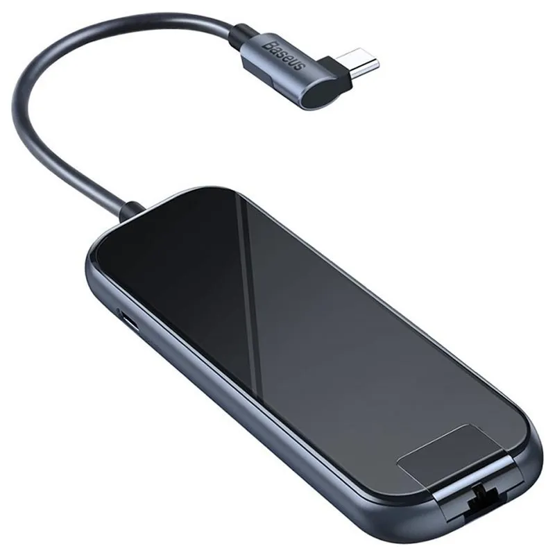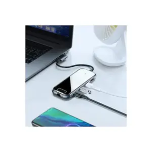Adaptorul Multihub Multifunctional de la Baseus are un design modern fiind realizat din materiale de calitate (Aliaj de aluminiu, sticla si plastic) si este foarte practic avand un total de 6 porturi: 3xUSB3.0 + HDMI 4K + RJ45 + PD. Baza are doua picioruse din cauciuc ce nu permite alunecarea pe suprafetele netede.