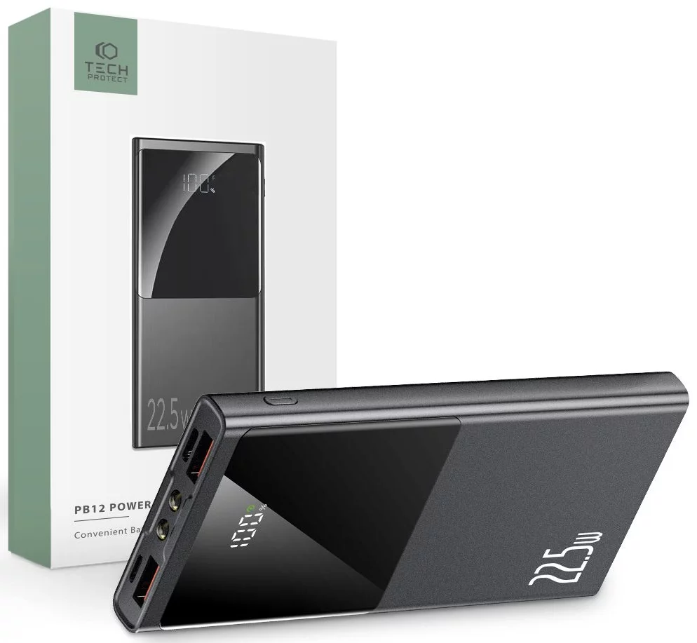 PB12-22.5W cu o capacitate de 10000mAh este un power bank functional care a fost creat de renumitul brand Tech-Protect. Puterea sa este de 22,5 W, ceea ce va permite sa incarcati rapid chiar si mai multe dispozitive in acelasi timp. Accesoriul accepta diverse protocoale de incarcare rapida, inclusiv PD3.0, QC3.0, AFC, FCP si SCP, ceea ce inseamna ca este compatibil cu o gama larga de dispozitive. Echipat cu patru porturi, inclusiv doua porturi USB-A si unul USB-C/Lightning. Power Bank nu numai ca poate incarca trei dispozitive simultan, dar poate fi incarcat si prin doua porturi USB-C si Lightning. Nu mai trebuie sa luati cabluri suplimentare cu dvs pentru a va incarca atat dispozitivele, cat si bateria in sine. Designul subtire il face confortabil in utilizarea de zi cu zi. Il poti pune cu usurinta in buzunar sau in geanta. Afisajul digital mare cu LED va permite sa controlati energia ramasa. Datorita citirii procentuale, puteti verifica rapid cata energie ramane in dispozitiv, ceea ce este foarte practic pentru a fi mereu pregatit pentru calatorii mai lungi. Power Bank este echipat cu o alta functie utila – o lanterna – ceea ce o face si mai practica. In plus, datorita sistemului inteligent de senzori de protectie, dispozitivul protejeaza impotriva unor astfel de amenintari precum supraincarcarea, scurtcircuitul sau descarcarea, ceea ce permite o utilizare sigura si fiabila.