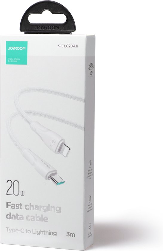 Cablu de date Joyroom USB-C – Lightning cu putere de pana la 20 W pentru incarcare rapida si transfer de date, 3 m lungime, Alb.