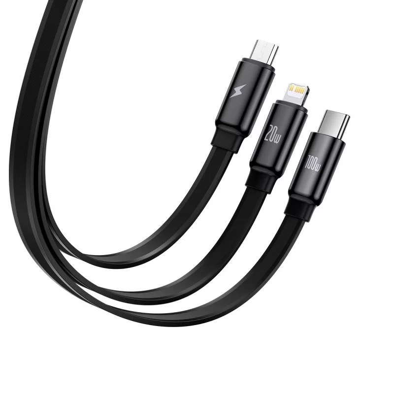 Nu mai trebuie să așteptați la nesfârșit pentru ca dispozitivul dvs. să se încarce! Cablul Baseus are 3 porturi, astfel încât veți reînnoi puterea mai multor dispozitive simultan. Portul Lightning (20 wați) vă va permite să încărcați un iPhone 8-13, în timp ce USB-C (100 wați) va încărca dispozitive de la Apple, Huawei, Xiaomi, Samsung etc. Mai mult, cu PD 100 W, veți încărca un MacBook Pro 2019 în aproximativ 2 ore și un iPhone 13 Pro Max în aproximativ 1,5 ore.