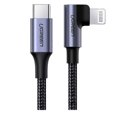 Cablu pentru incarcare si transfer de date UGREEN Elbow US305, USB Type-C/Lightning, certificare MFi, Power Delivery, 3A, 1m, Gri