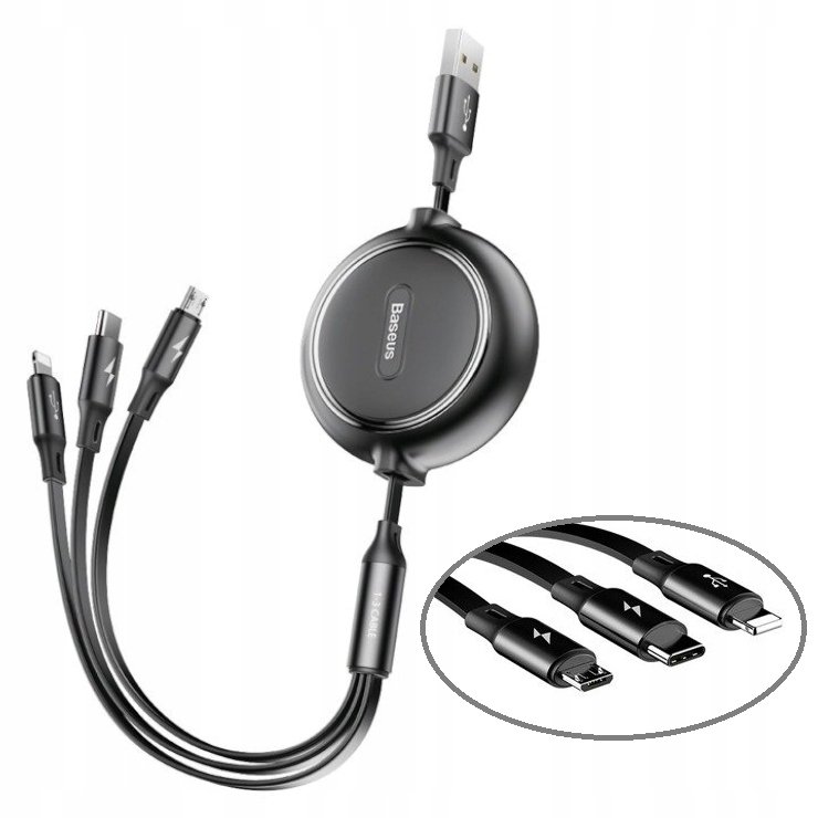 Cablu retractabil Baseus Golden Loop 3in1 USB – micro USB / tip lightning / USB-C 3.5A 35cm – 120cm negru (CAMLT-JH01)