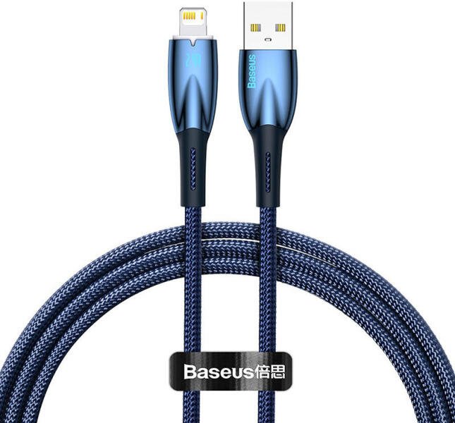 Cablu Baseus USB la USB Lightning din Seria Glimmer, potrivit pentru iPhone/iPad/AirPods, cu lungimea de 1 m, 2.4 A, Albastru/Gri.