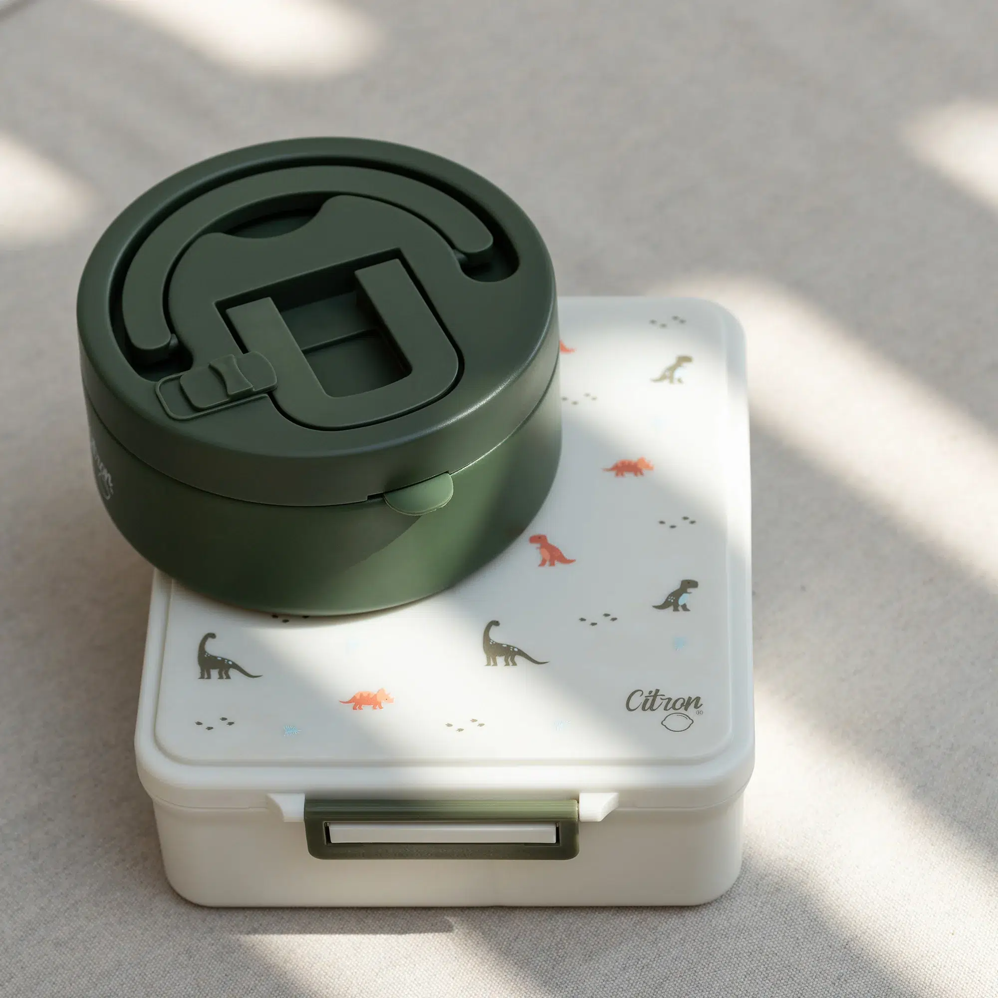Caserolã prânz mare cu 4 compartimente si 1 borcan termoizolant verde-Dino