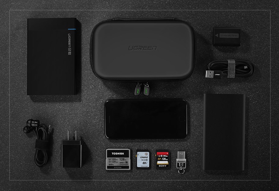 Carcasa UGREEN, in care putem incadra un SSD, precum si diverse accesorii, cum ar fi un incarcator, cablu USB, unitate flash USB, carduri de memorie, adaptoare, etc. este fabricat dintr-un material EVA durabil si mai mult decat atat este impermeabil si are dimensiuni compacte, ceea ce face posibila luarea ei in orice calatorie.