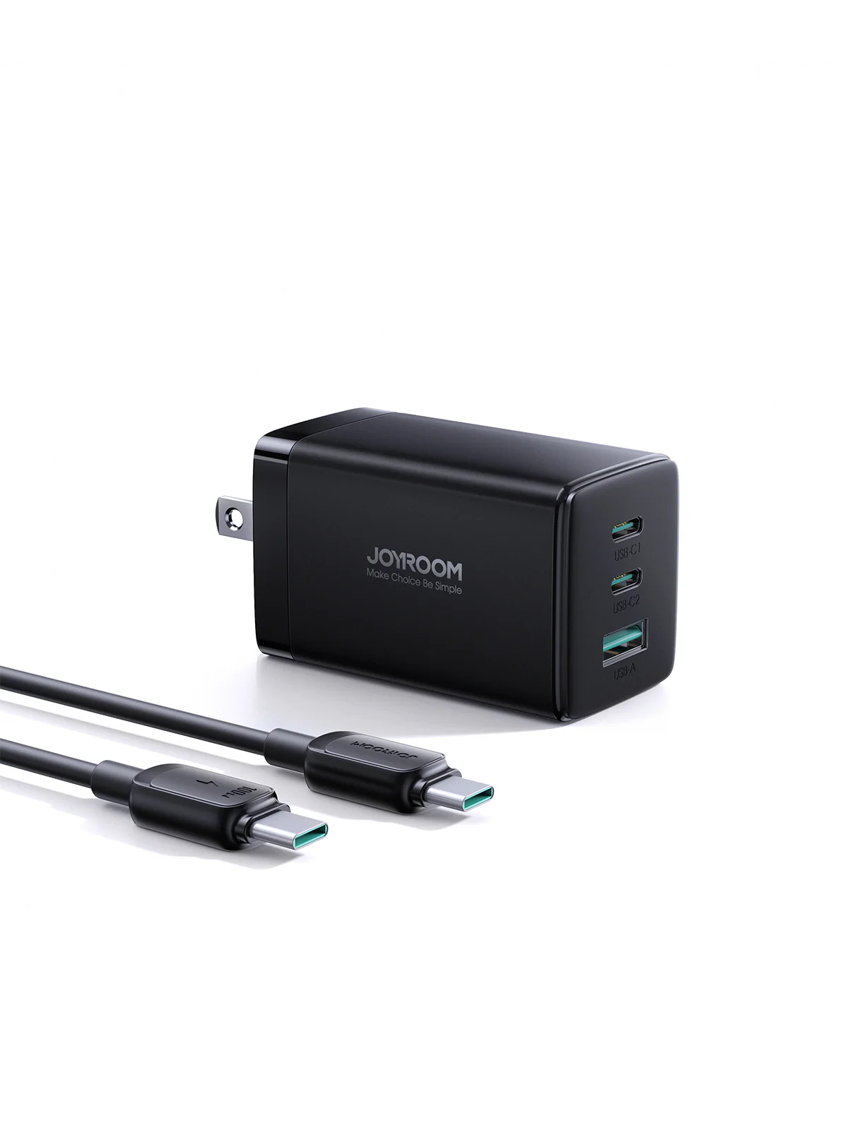 Incarcator de retea Joyroom TCG01, tehnologie GaN, 65W, 1 port USB si 2 porturi USB C, cablu USB C la USB C 1.2m inclus, 100W, functie de incarcare rapida, Negru