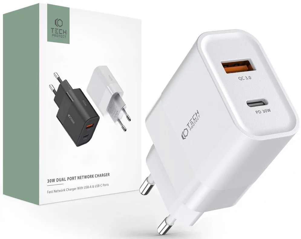 Incarcator retea TECH-PROTECT C30W, USB/USB-C, Quick Charge 3.0, Power Delivery 30W, Alb